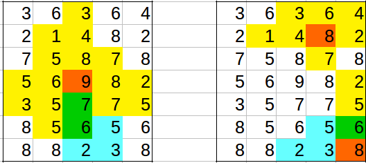 让我们从左边图像中的橙色9开始,沿着绿色的路径一直走到蓝色的5。从这里我们也可以得到蓝色3和蓝色2。我们完成了左边橙色9的算法。