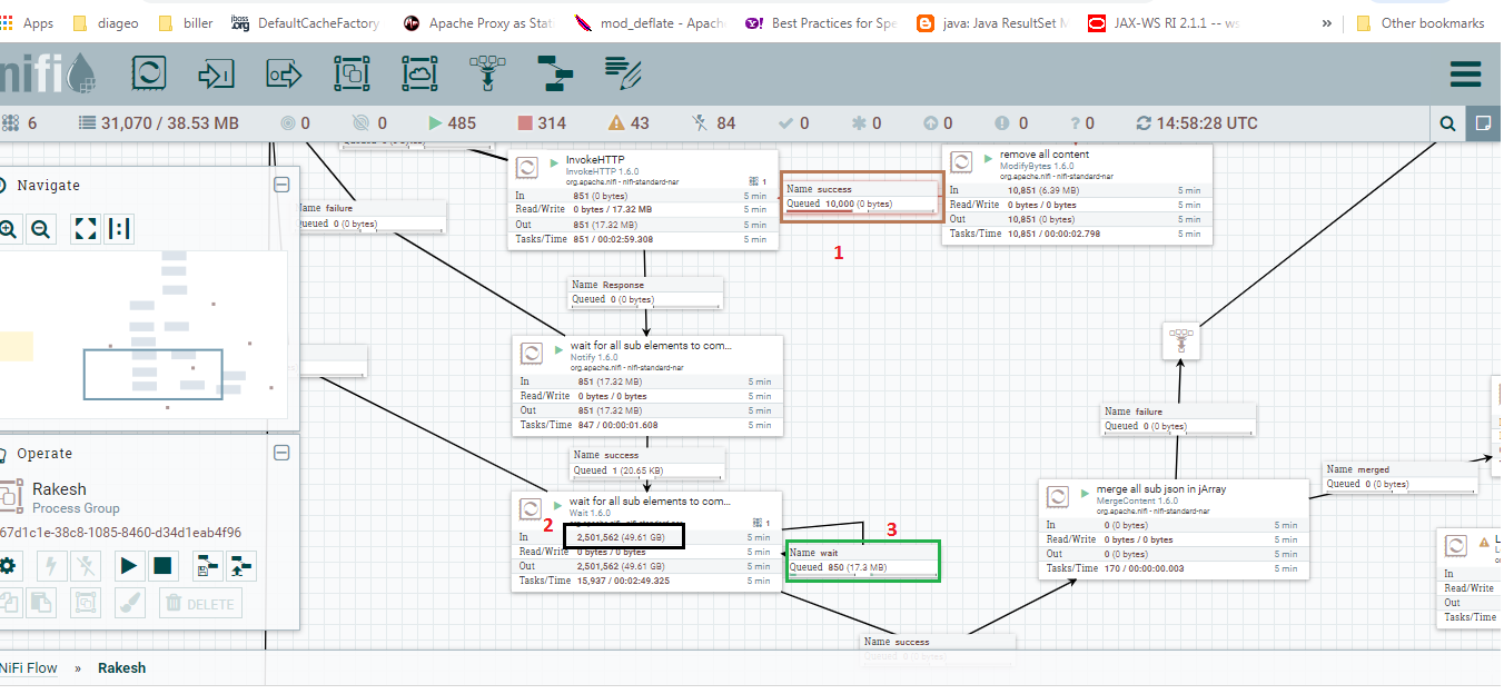 1)是的,增加InvokeHttp上的并发任务可能是有意义的。我不会跳到10,但会测试从1增加到2,2到3,等等,直到它看起来更好。并发任务是可以并发执行处理器的线程数,NiFi实例的线程总数是在计时器驱动线程下的控制器设置中定义的,您应该根据CPU/core的#设置计时器驱动的线程。