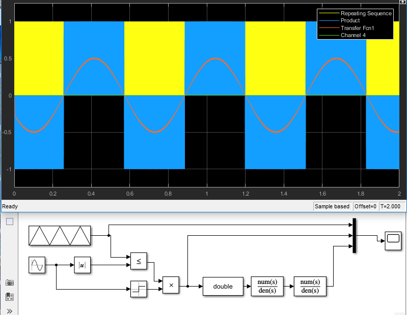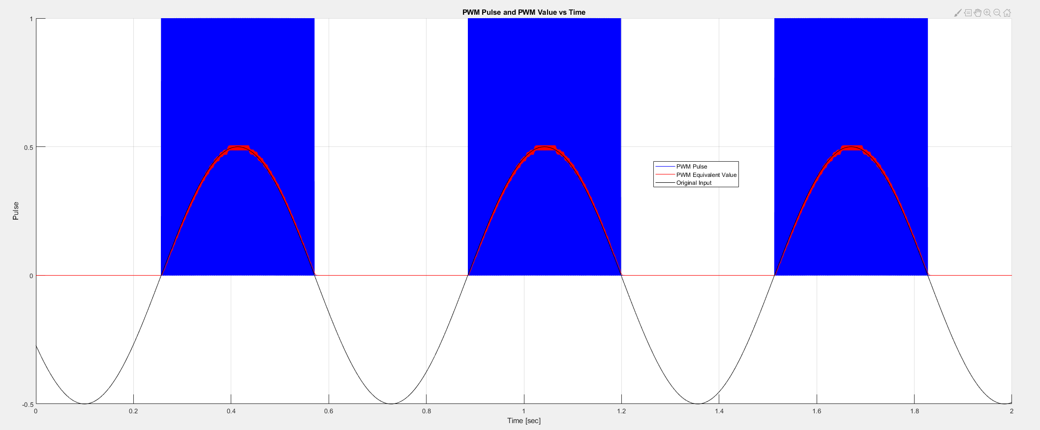 很容易看出,通过给出蓝色脉冲(通过比较载波和正弦波产生),系统的输出(红线),设法跟随原始输入(黑线)。但是,只有当原始输入为正时才会发生这种情况。