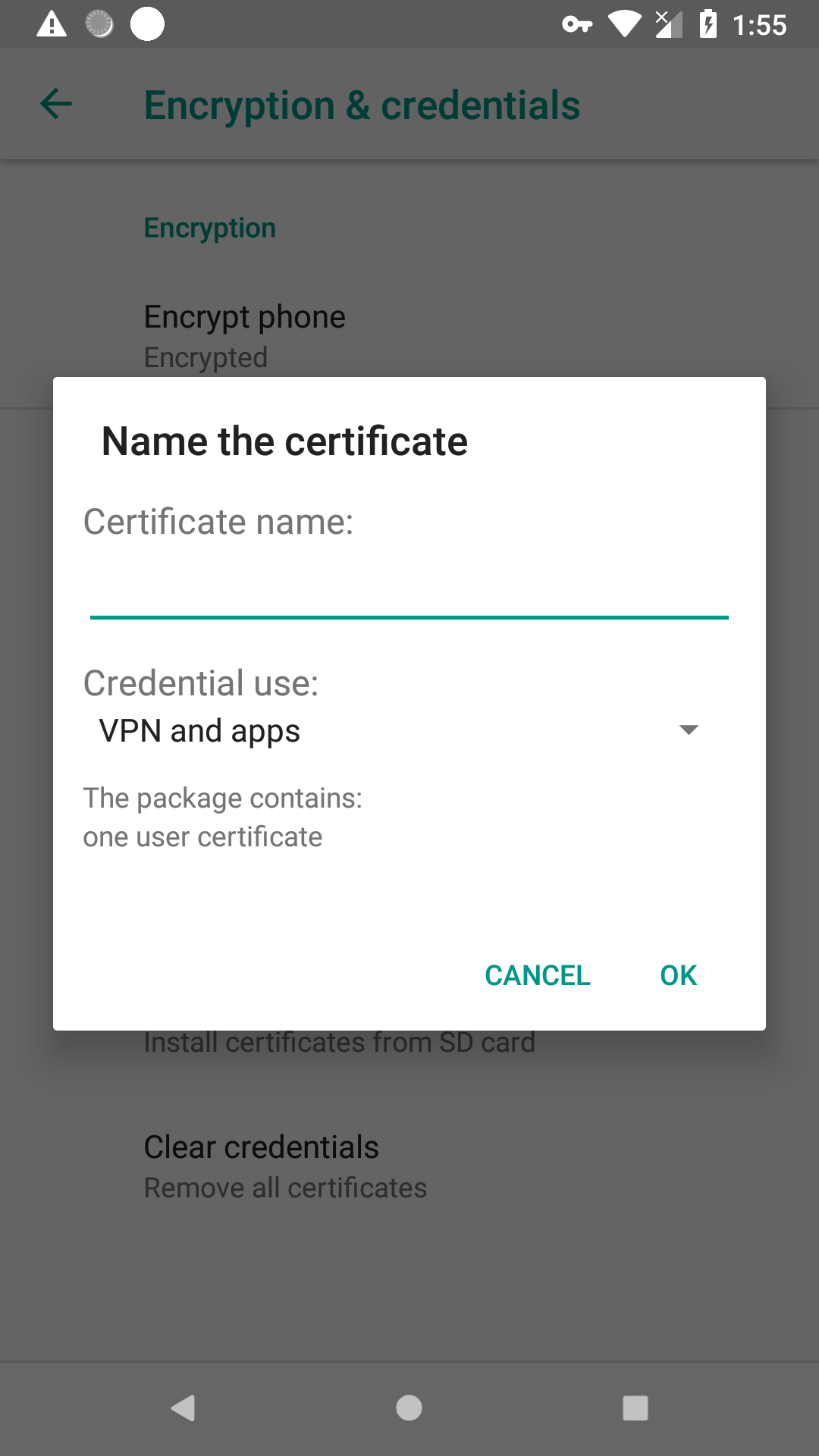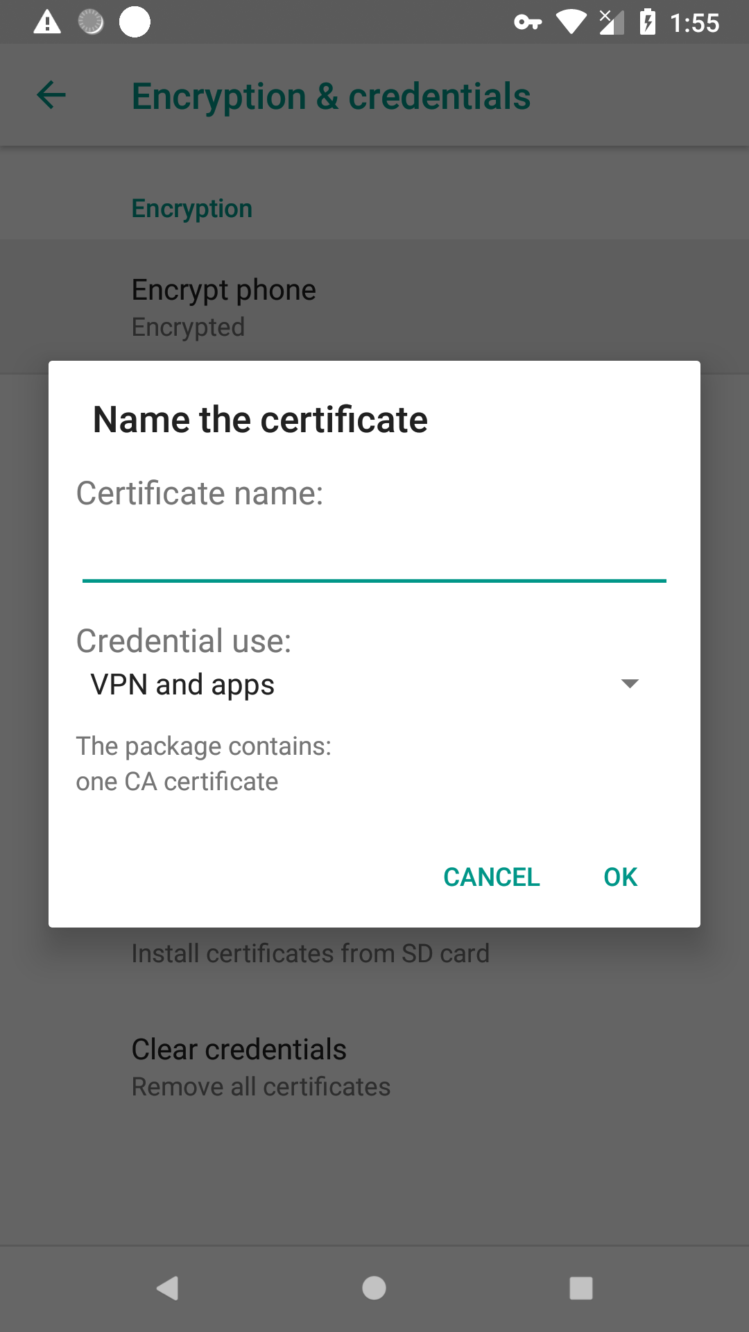 但是,要在Android上安装它,您需要从输出cacert.pem中删除人类可读的文本,只留下证书数据,即以-----BEGIN CERTIFICATE-----开头并以-----END CERTIFICATE-----结尾的证书数据,否则Android会说“没有安装证书”。
