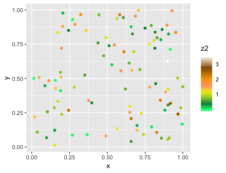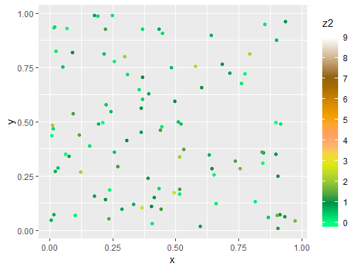 geom_point(aes(colour = z2))+scale_colour_gradientn(colours = c('springgreen1', 'springgreen4', 'yellowgreen','yellow2','lightsalmon','orange','orange3','orange4','navajowhite3','white'),breaks=c(0,1,2,3,4,5,6,7,8,9))