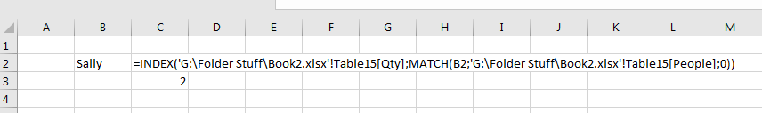 =INDEX('G:\Folder Stuff\Book2.xlsx'!Table15[Qty],MATCH(B2,'G:\Folder Stuff\Book2.xlsx'!Table15[People],0))