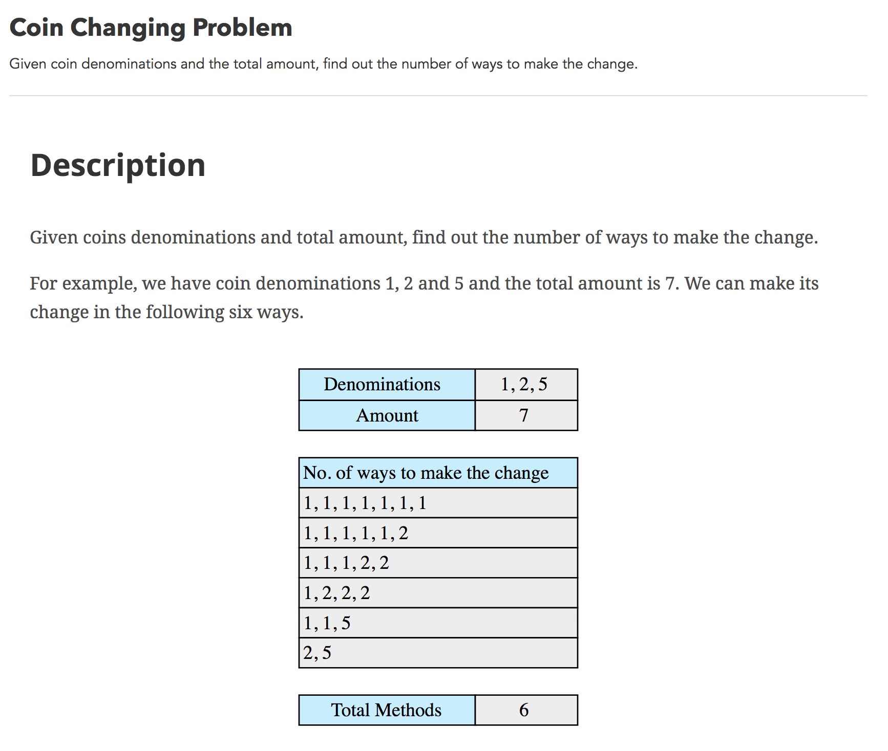 我想我应该使用以下递归关系:在这个例子中,使用(1, 2, 5)生成7的方法的数量是使0, 1, ..., 7与面额(2, 5)的方法的数目之和(也就是说,对于第一枚硬币的数量,1的每一个选择,对一组较小的面额进行递归调用)。