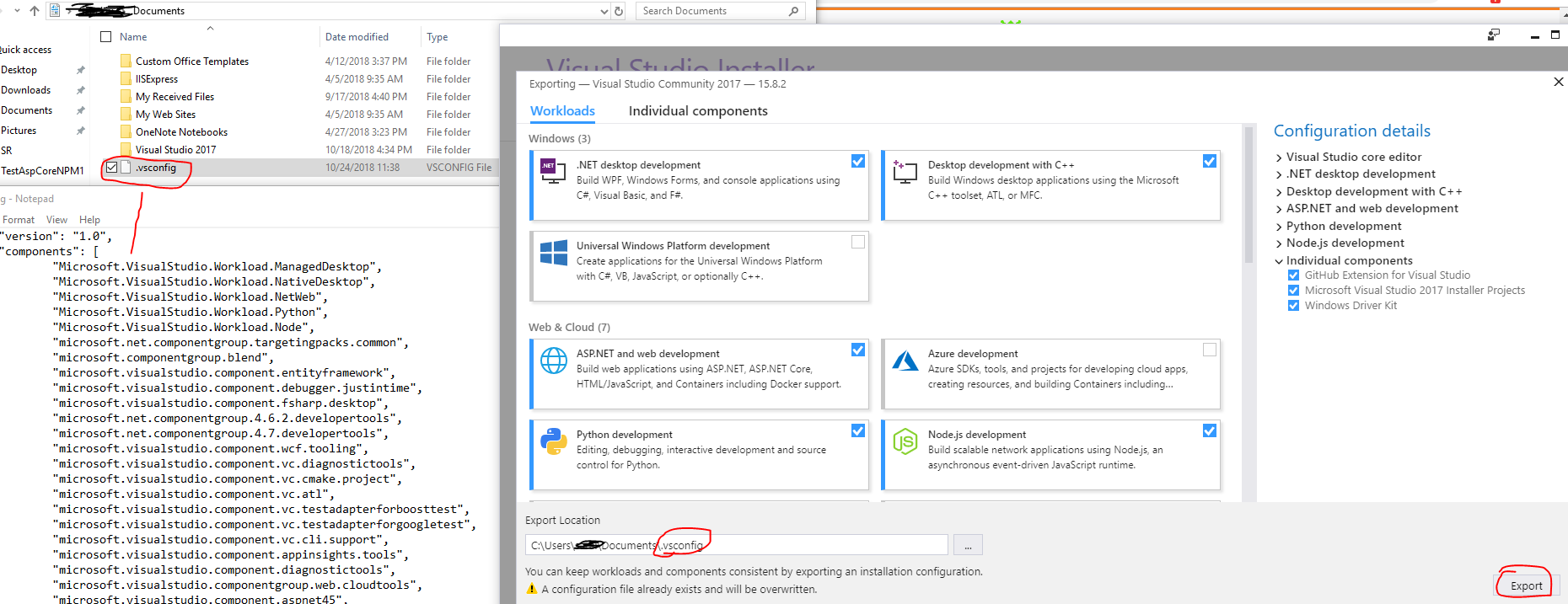 请以管理员身份运行VS安装程序,并单击More-Export ,按照步骤执行,然后将得到列出已安装的工作负载和组件的.vsconfig文件,如下所示: