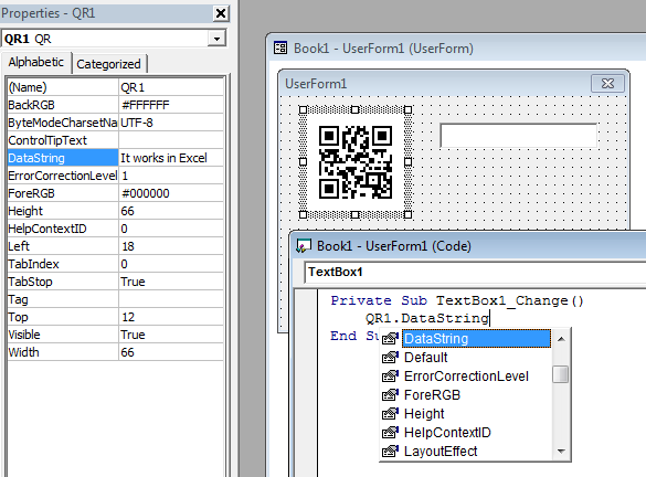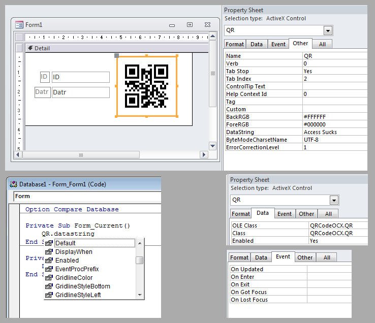 最后,我制作了一个包含几个关键属性的OCX:DataString (要显示的字符串)、ByteModeCharsetName、ErrorCorrectionLevel、ForeRGB和BackRGB,还有方法Refresh、Cls和events OnClick和OnDblClick。