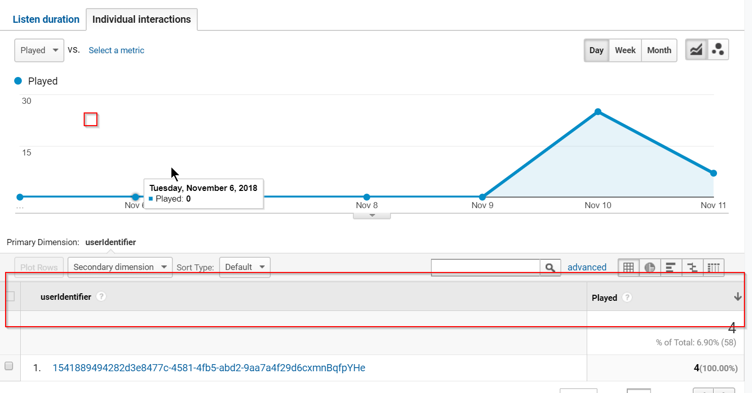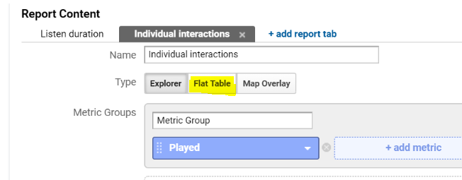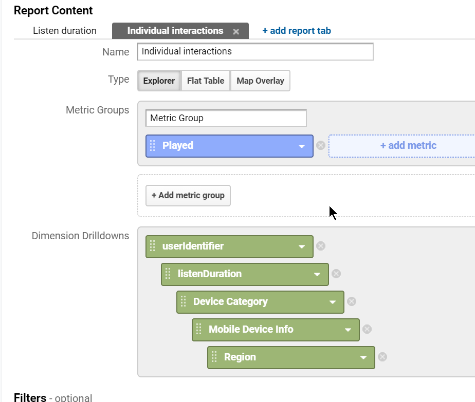 您选择的报表类型(或者更确切地说是默认类型)是Explorer,它返回一维和随时间变化的图形,并提供维度值上的链接,这些链接允许您向下钻取。通过选择报表类型平面表,将返回所有维度,但不绘制时间序列图。不过,请注意,如果您将自定义维度拉到自定义报告中,并且没有为该命中设置值(或会话取决于CD作用域),则它将不会报告任何信息,因此您可能会得到一些奇怪的结果。