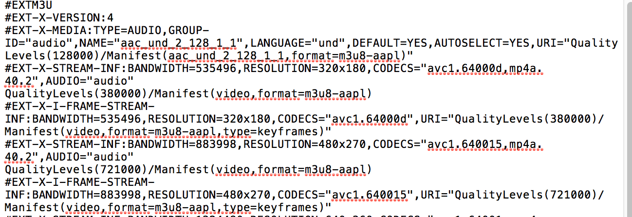 在解析主播放列表后,我将获得音频和视频的单独url,因此我无法使用音频播放特定质量的视频。实际上,我想在播放器中实现视频的手动比特率控制,为此,我解析主播放列表,以获得不同比特率视频的url。我正在从Azure媒体服务获得HLS文件,其中视频是用不同的比特率编码的。下面显示了我的主播放列表的样子: