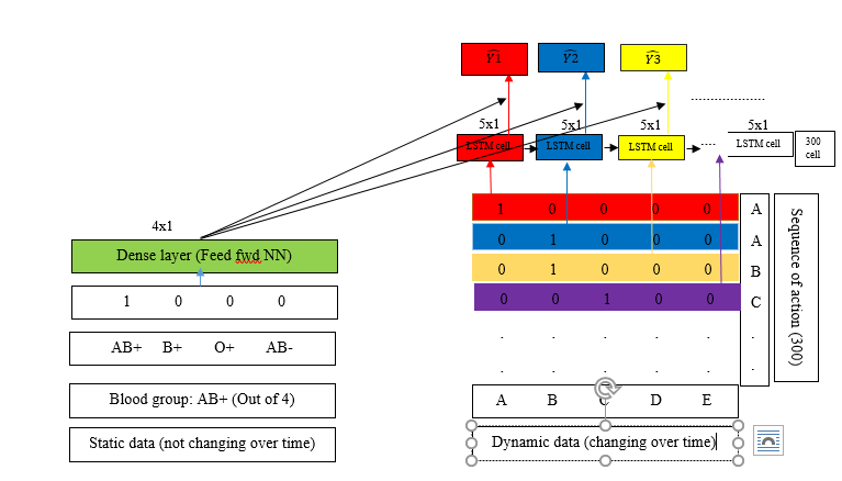 我想在LSTM层传递序列数据,在另一个前馈神经网络层传递静态数据(血型、性别)。稍后我想把它们合并。然而,我对这里的模糊感到困惑。
