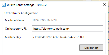 我在Windows 10家庭机器上安装了Uipath Studio Enterprise试用版2018,我正在尝试将一个机器人连接到编排器社区版(2018),但我的机器人状态总是在编排器中断开连接