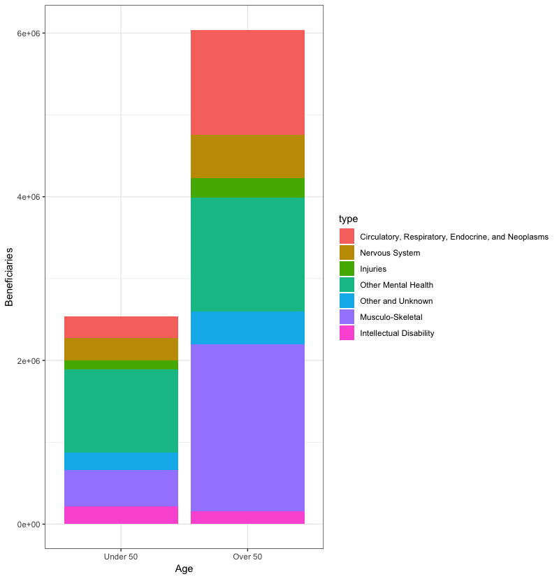 geom_bar(aes(y = Beneficiaries, x = Age, fill = type),