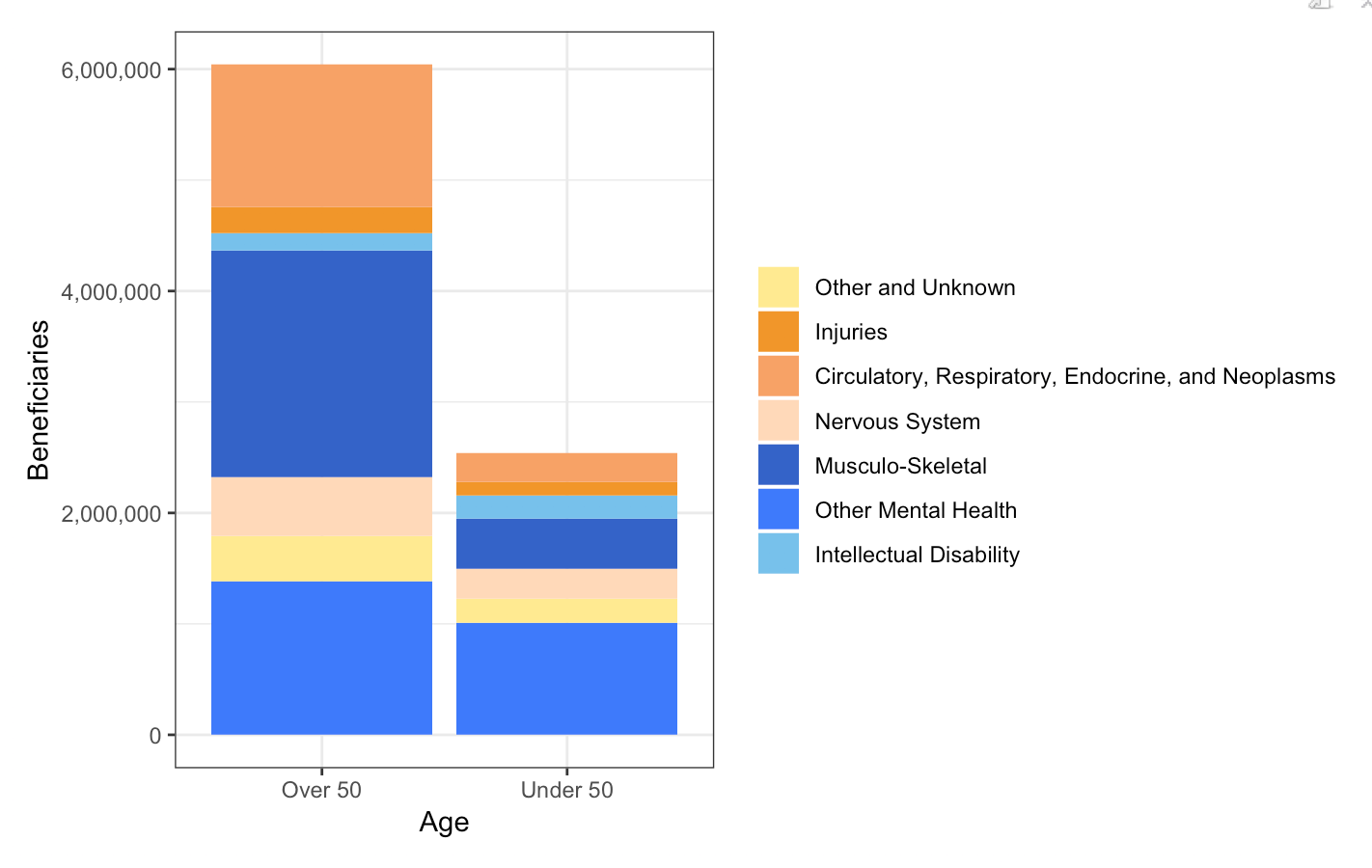 sdi_data_2$type <- factor(sdi_data_2$type, levels = c("Circulatory, Respiratory, Endocrine, and Neoplasms","Nervous System","Injuries","Other Mental Health","Other and Unknown","Musculo-Skeletal","Intellectual Disability"))