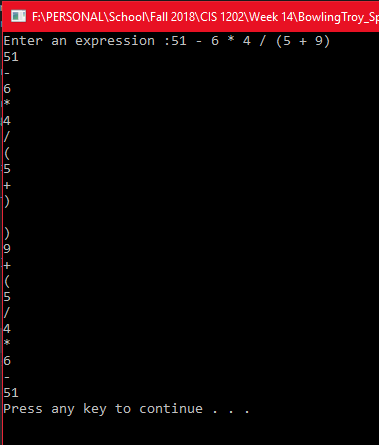 我在做一项任务。我已经对作业进行了编码,除了输出缺少一个数字外,一切都按其应有的方式工作。我还附上了样本输出。在将数学表达式输入字符串(例如,35 * 4 - 6 / (9 + 3) )后,将删除一个数字。在正常情况下,3将失踪。按相反的顺序,9将丢失。我不明白为什么会发生这种事。