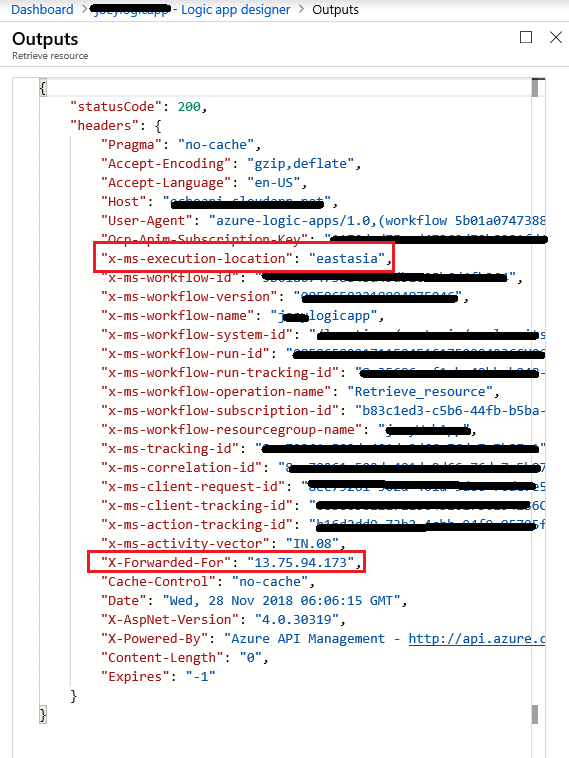 当您使用逻辑应用程序调用APIM时,您可以在输出中看到-转发-为属性,这是标识通过HTTP或负载平衡器连接到web服务器的客户端的原始IP地址的一种常见方法。