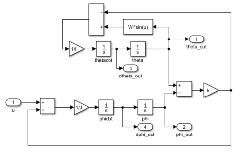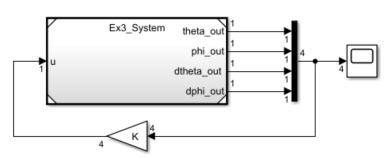 一旦完成,您所得到的维度错误是因为您的控制器需要u作为标量,但是您要向其中输入一个4元素向量。您需要更改Gain块的适当参数,以便它进行矩阵乘法,将4乘1矩阵K和(矩阵)与4元素"out“信号相乘以生成标量。