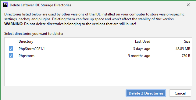 每次我将PhpStorm升级到一个新的点发行版时,我都会在我的主目录中保留上一个版本。我现在有了PhpStorm2017.1、PhpStorm2017.2、PhpStorm2017.3、PhpStorm2018.1、PhpStorm2018.2和当前版本PhpStorm2018.3的目录。它们在我的主目录中占据了大约4.5GB的空间,我想恢复它。