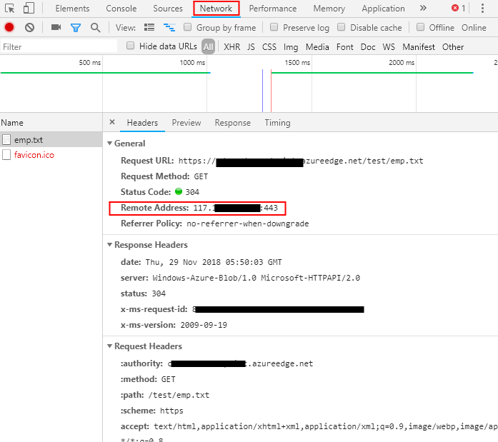 如果您使用的是windows机器,则可以从铬浏览器中获取远程地址,当您通过单击F12按钮将HTTP/HTTPS请求发送到cdnedpoint时,您将看到服务器IP地址。