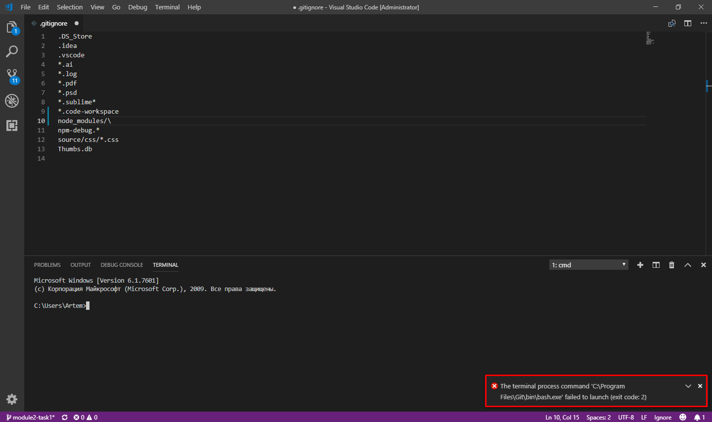 终端进程命令'C:\Program Files\Git\bin\bash.exe‘启动失败(退出代码: 2)