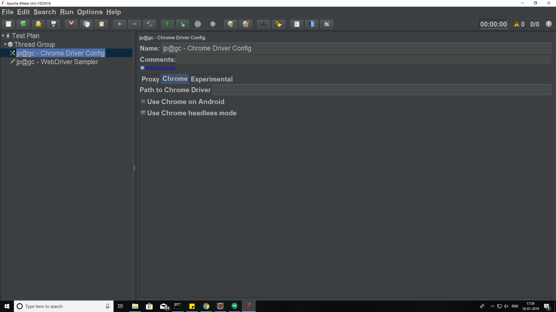 因此,如果您使用chrome浏览器,我们可以选择运行webdriver而不打开浏览器。您可以添加jp@gc驱动程序Config配置元素,其中有3个选项卡,它们是“代理”、“铬”和“实验性”。因此,您单击“铬”选项卡并选中的复选框“使用Chrome无头模式”。请看下面的截图。