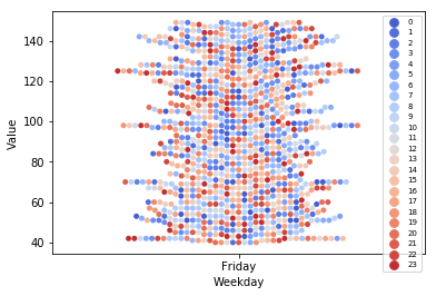 sns.swarmplot(x="Weekday", y="Value", hue="Hour", palette="coolwarm", data=df)