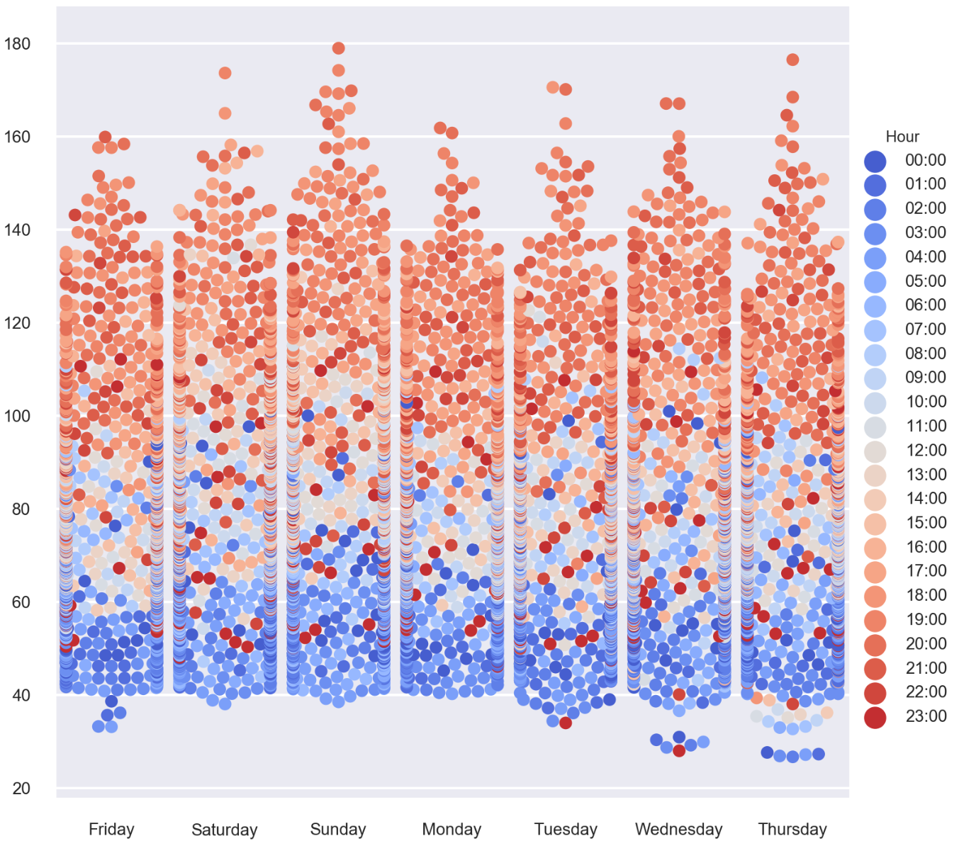 我想要一个熊猫数据的猫,其中包含一个数字值的所有时间一年。它有3列:小时、工作日和价值。我的情节是这样的: