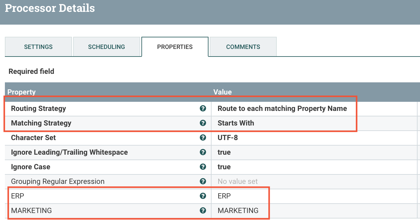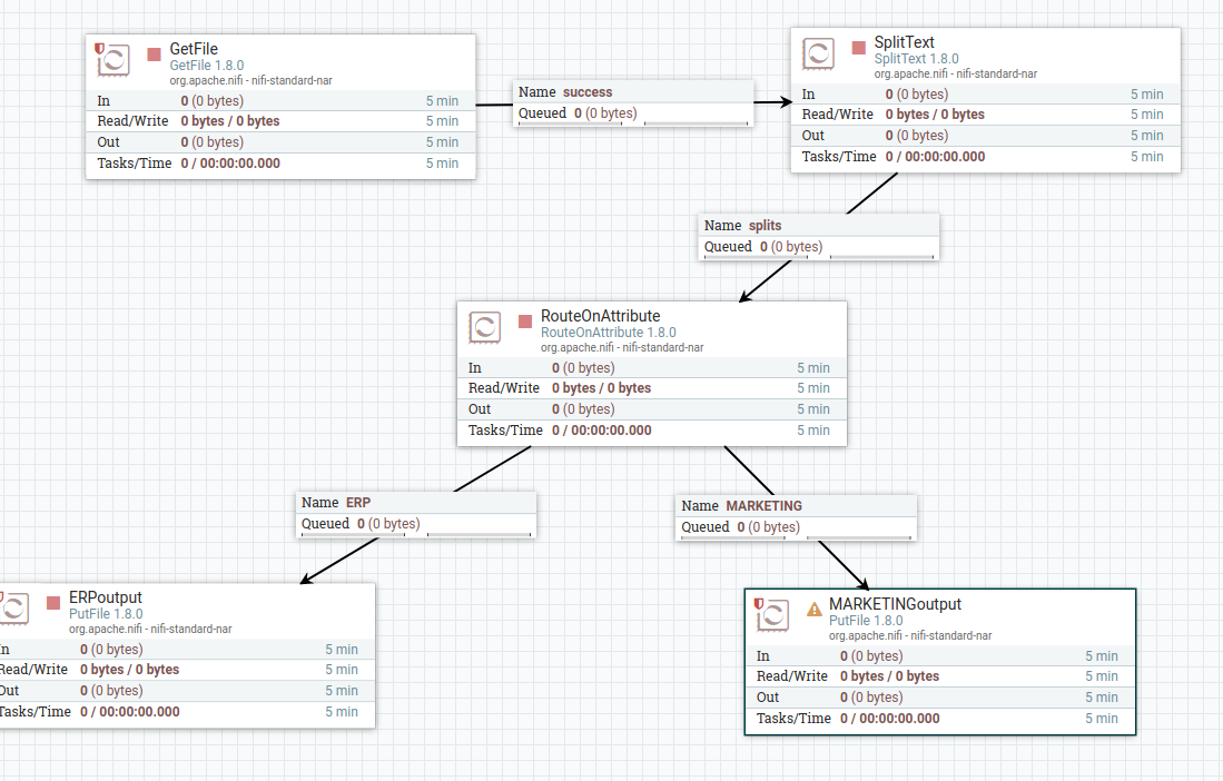我有一个如何做它的想法,但我的问题是关于我正在使用的RouteOnAttribute处理器,我不知道如何引用第一列,并指出什么是价值(ERP或市场营销)以后发送到正确的输出目录。