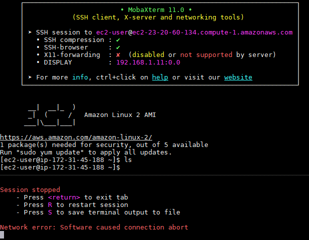 我正在经历这个奇怪的问题,在这里,我可以将SSH连接到一个新的EC2实例上几秒钟,然后连接就会自动下降,一旦它被删除,我就不能再重新连接,而EC2实例仍然显示在上运行。