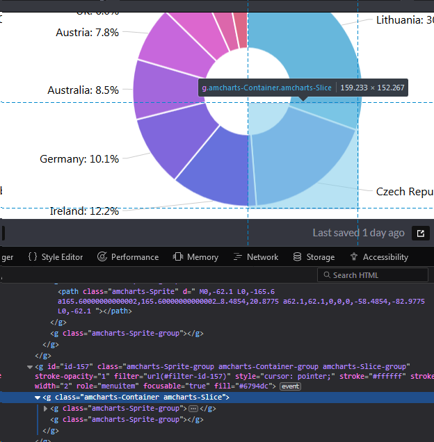 您可以看到,SVG元素现在已经为它自己的amCharts类以及从amcharts-开始继承的类提供了CSS类。例如,Slice扩展了Container,因此它将具有CSS类amcharts-Slice和amcharts-Container,例如: