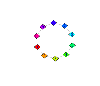 plot(g, vertex.shape = "rhombus", vertex.color = rainbow(vcount(g)),