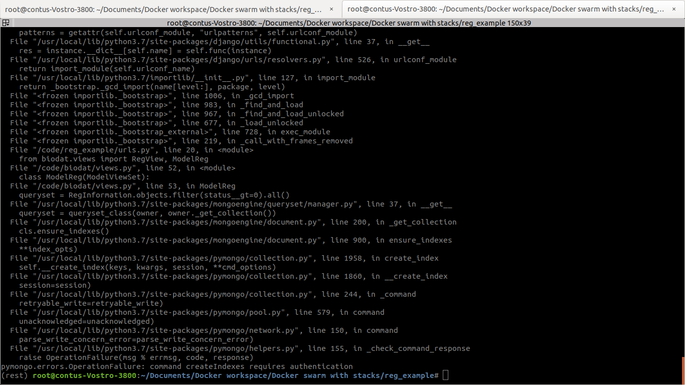 我想要创建,两个,一个是mongodb服务,另一个是使用django构建web服务。我需要那个网络服务(django应用),它需要连接到mongodb码头服务。