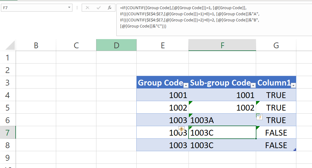 IF(((COUNTIF($E$4:$E7,[@[Group Code]])=1)+0)=1, [@[Group Code]]&"A",
