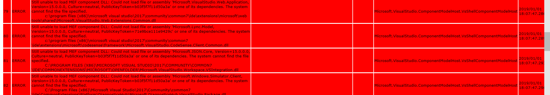 在googling之后,我找到了一种在应用程序启动时获取日志文件的方法。xml文档指示启动时出现4个错误。看起来有些组件无法加载。我不知道为什么。我是附加在这里的日志文件显示4个错误的屏幕截图。整个日志文件- VS 2017日志文件