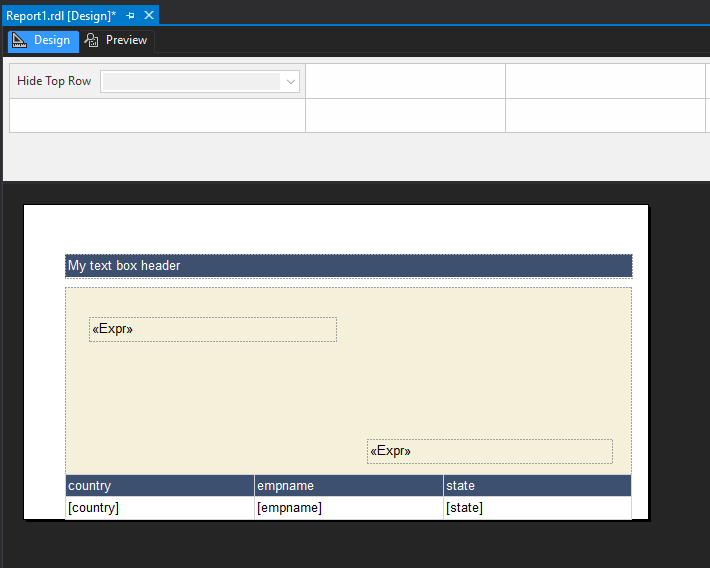 行可见性被简单地设置为参数值=Parameters!HideTopRow.Value=1。黄色部分中的文本框只是数据集中的一些任意值。