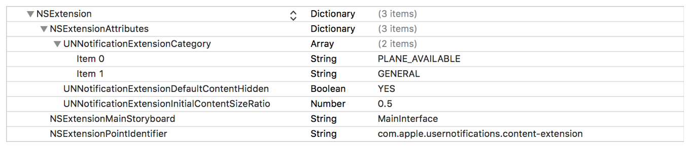只需单击+按钮,当您将鼠标移到一行并将新行的名称编辑到NSExtension/UNNotificationExtensionCategory时,该按钮就会出现。之后,从name字段旁边的下拉列表中选择每一行的正确类型。