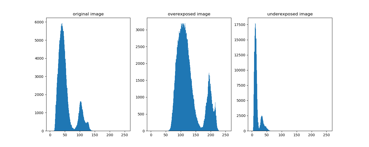 如果绘制这三幅图像的直方图,它们将如下所示: