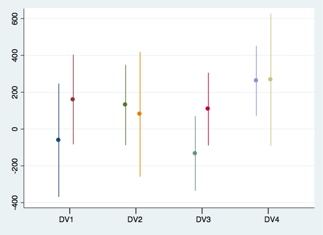 coefplot (A, offset(-0.38)) (E, offset(-0.33)) ///