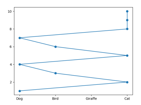 我想要做一个线状图,其中本质上(狗,1),(猫,2),(鸟,3)等等都是用线绘制和连接的。另外,我希望能够确定X轴中标签的顺序。Matplotlib自动绘制命令“狗”、“猫”和“鸟”标签。尽管我尝试重新排列命令‘狗’,‘鸟’,‘长颈鹿’,‘猫’,图形没有改变(见图)。我该怎么做才能相应地排列图表呢?