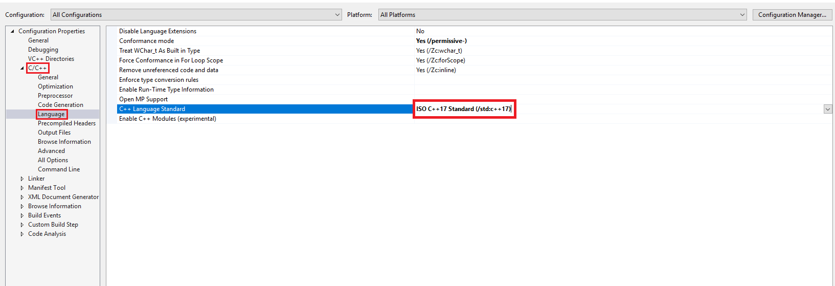 并将C++ Language Standard设置为ISO C++17 Standard (/std:c++17)