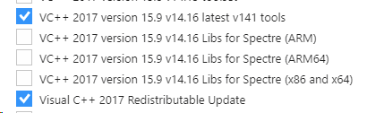 我正在使用VisualStudio2017- 15.9.7进行C++开发,看起来我已经安装了必要的模块。