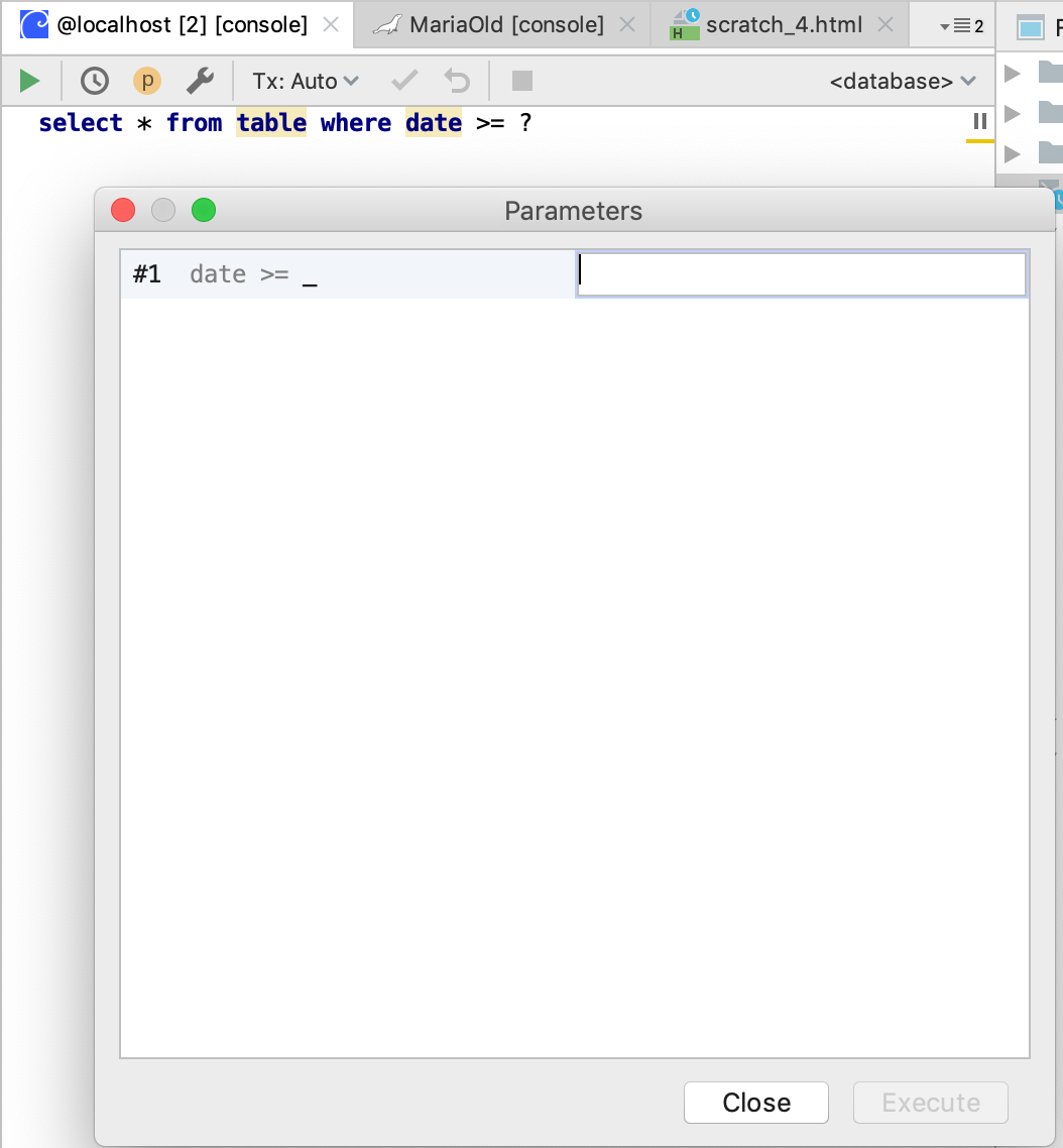 您还可以使用预定义的参数轻松地将它们绑定到查询中,可以在以下链接中找到更多的数据:https://www.jetbrains.com/help/datagrip/settings-tools-database-user-parameters.html。