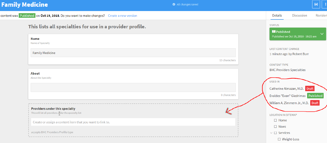 现在我想要的是,当我看到“家庭医学”这一专业内容时,Giedrimas博士应该以一名医生的身份出现在“家庭医学”中。现在我确实在标题下的“家庭医学专业”的右边看到了这个,但是我不能访问这个列表。