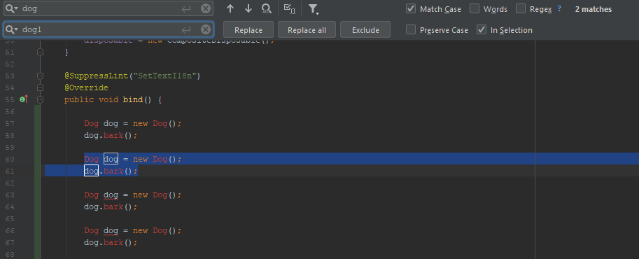 我希望能够将dog对象的第二份副本转换为dog1,并使用dog1.barb代替dog.bark()。我还想把第三个狗对象重命名为dog3,然后调用dog3.bark。有什么捷径可以让我在android工作室只重命名代码的某些部分吗?