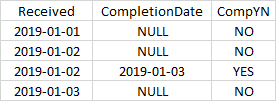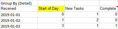 我希望计数那些未用少于行的接收日期(按接收日期“详细信息”分组)标记为已完成的记录--这将是显示队列中有多少记录的“日开始”列。