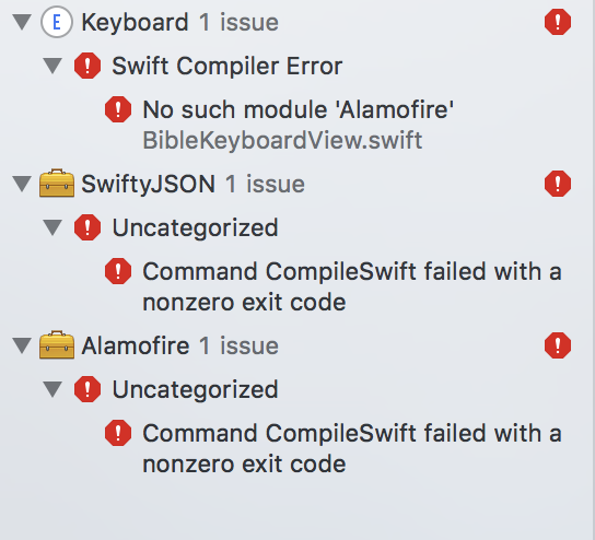 我在我的自定义键盘扩展中使用了Alamofire和SwiftyJSON。我在视图中创建了一个键盘,并将它放置在视图控制器中。我想使用相同的文件来表示键盘,所以我创建了一个新的目标“键盘”,并在键盘扩展名和BibleKeyboardView.swift文件的项目中添加了target成员资格。但是,一旦添加了目标成员资格,就会得到错误的No such module Alamofire和Command CompileSwiftSources failed with a nonzero exit code。即使当我关闭Keyboard的目标成员资格时,它仍然有Command CompileSwiftSources failed with a nonzero exit code。我也打开.xcworkspace文件。