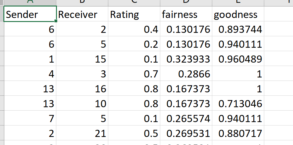 我有一个csv文件,其中有5列发件人,接收器,重量,公平评分(发件人),善良评分(接收者)。