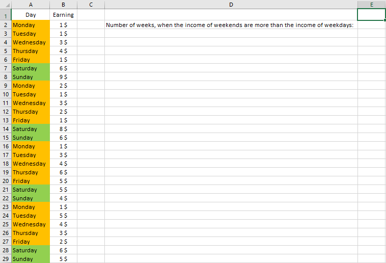 例如,在第一周:平日收入=10美元,周末收入=15美元。周末收入>工作日收入