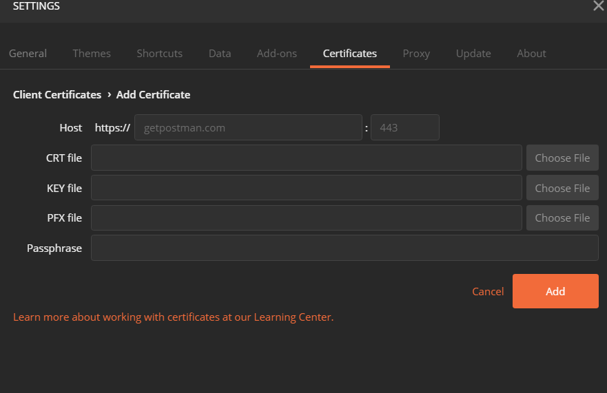 但是,您可以使用.PFX从openSSL文件中提取证书和私钥,并在Postman中配置这些密钥。