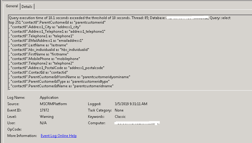 理想情况下,您可以调优生成的Microsoft查询,减少存储在Microsoft中的数据量,或者使用更好的硬件来提高Microsoft SQL Server的总体性能。对CRM的大多数查询应该在不到一秒钟内执行,如果您看到这10秒或更长的查询发生了许多事件,这表明可能会出现一些性能问题。请注意,根据用户的数量、用户正在执行的操作以及Microsoft中的数据量,偶尔出现更长的查询是正常的。如果它们经常发生,那么就应该开始考虑调优了。可以使用应用程序事件日志中的这些事件作为研究要在Microsoft中优化哪些查询的起点。
