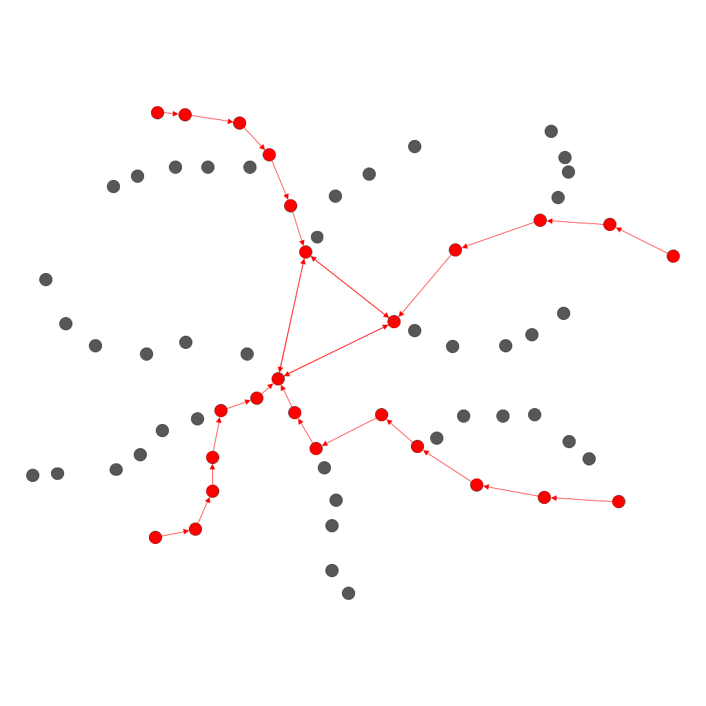 理想情况下,我的最终结果是,灰色节点只表明我只对n个最出现的路径感兴趣。在这种情况下,这4条通往中心的红色路径: