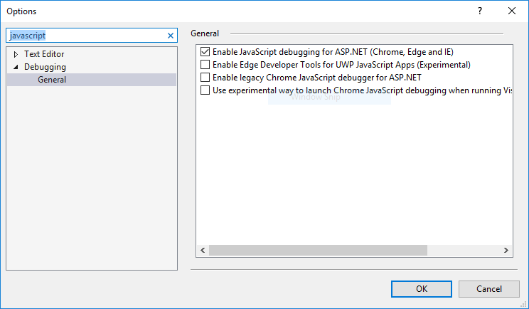 首先,我们需要确保Tools-Options-Debugging-General-为JavaScript (Chrome、Edge和IE)启用ASP.NET调试被检查,尝试安装或直接切换到其他浏览器如Chrome进行测试。
