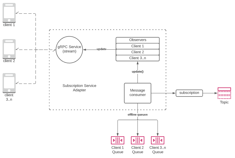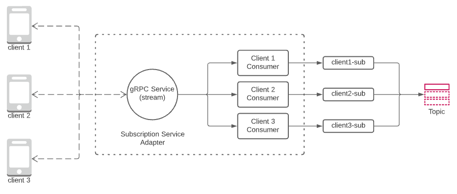 你最初的想法更好海事组织。我可能会做的是创建一个客户端可以连接到的gRPC流服务。实现本质上是一种观察者模式。使用者将收到一条消息,然后遍历订阅者,对所有订阅者进行“发送”。从那里开始,当客户端连接到服务时,它只会向该观察者集合注册自己,并在断开连接时取消注册。水平缩放是被动的,因为客户端对它们所连接的任何实例都很粘。